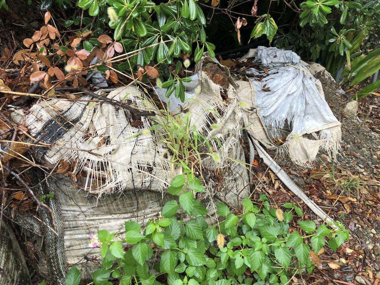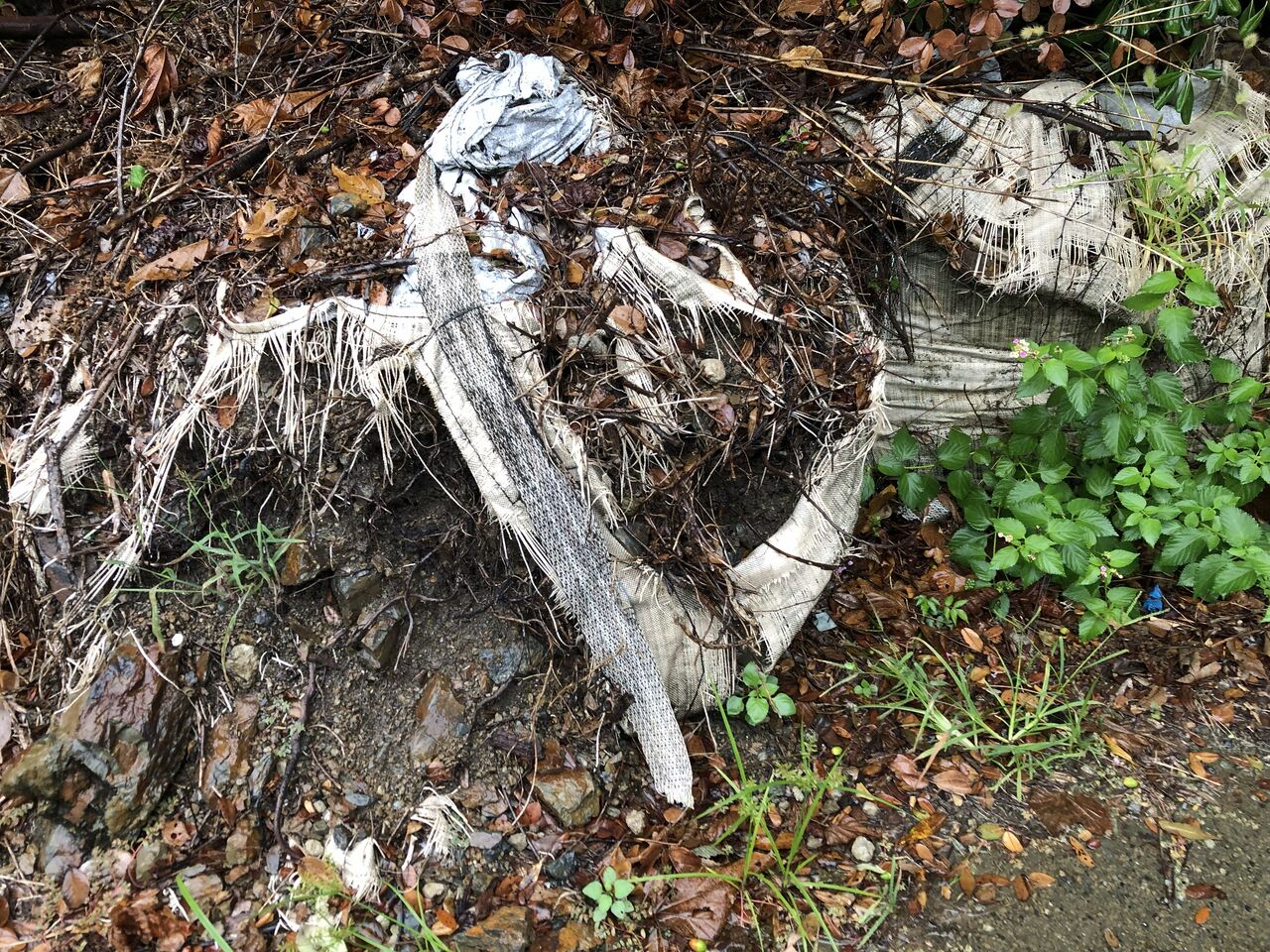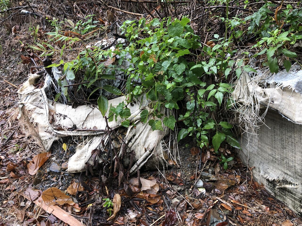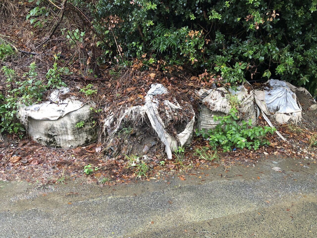 現場調査で出かけた際、道端でボロボロになった大型土のうを発見しました。