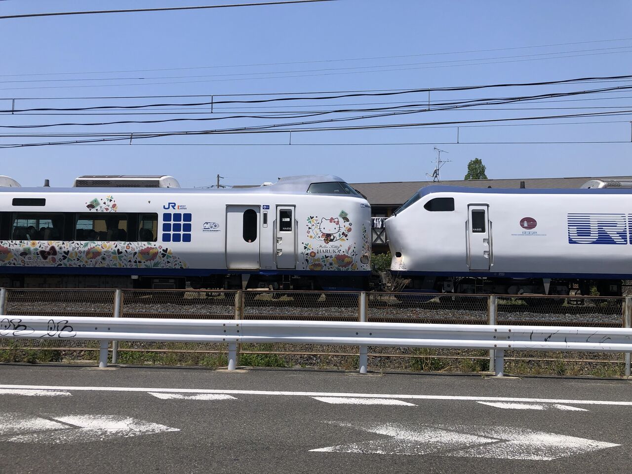 「キティちゃんはるか」特急だ。京都駅から関西空港へ向かうJR特急 2026年02月18日 07:16 「キティはるか」 JR関西空港線には、特急「はるか」キティちゃんラッピングが走っています。 それだけなんですが。。。。。 それだけです(笑) 一番後方はノーマルタイプの部分もありました。 いずれも目の前を通り過ぎていくのを写真撮りました、って話。 そんだけです。 でも、わかるかなぁ。。。。 実は、2編成分の写真なんだよね。 線路が手前と奥があると思うんだけど、実は、よく見ると、手前走っている写真と、奥を走っている写真があるんだ。 時間差で上り、下りの「特急はるか」が通ったので、連続で撮ってたって話。 なんです。 「鉄道など」カテゴリの最新記事 タグ :#特急#はるか#JR#キャラクター#キティちゃん < 前の記事次の記事 > コメント コメントフォーム 名前 コメント 記事の評価 リセット リセット 顔 星 情報を記憶 コメントを投稿する