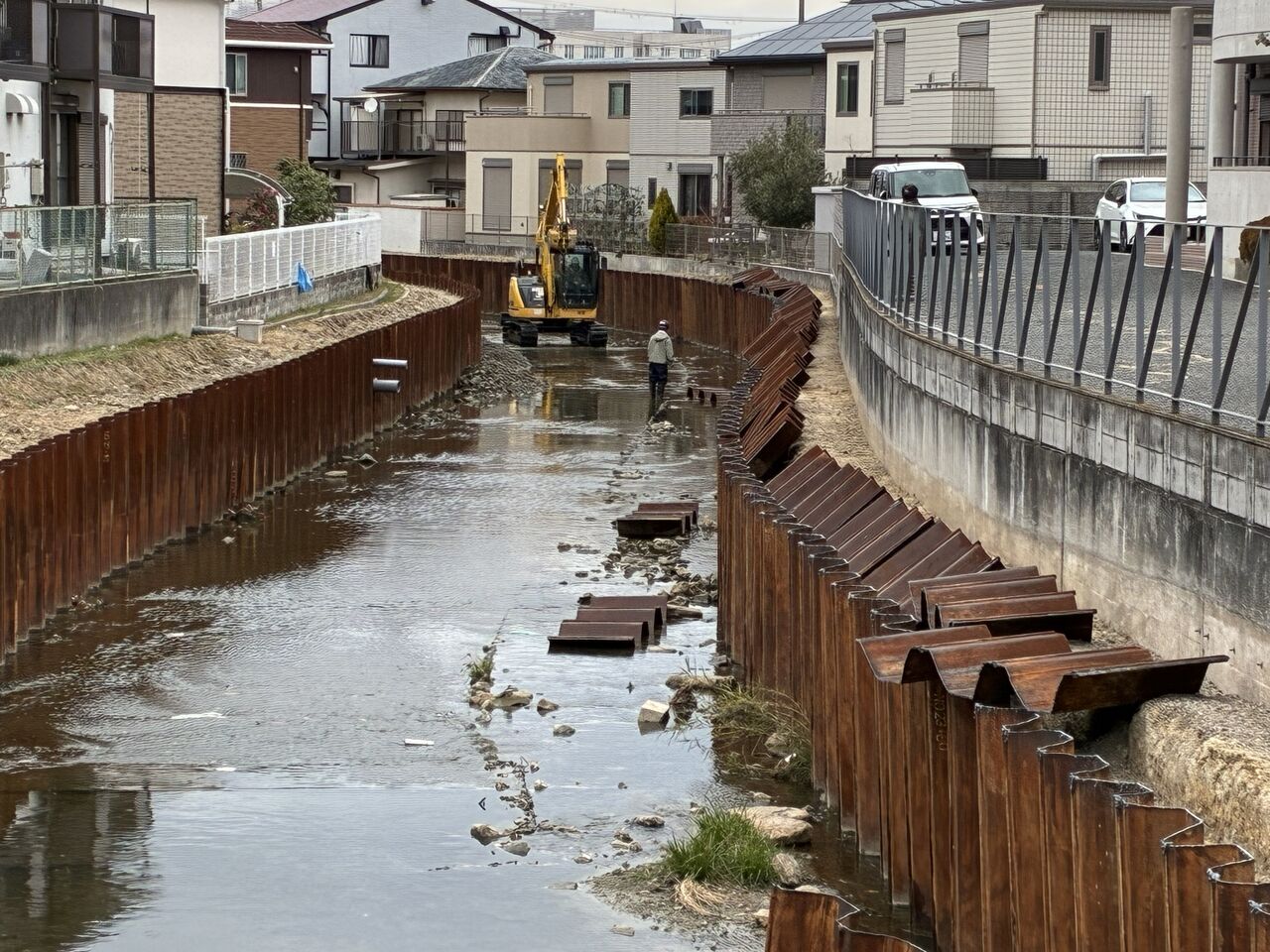 >>矢板打設河川改修箇所の上流側で仕上げ中(矢板打設後の護岸仕上げ中)