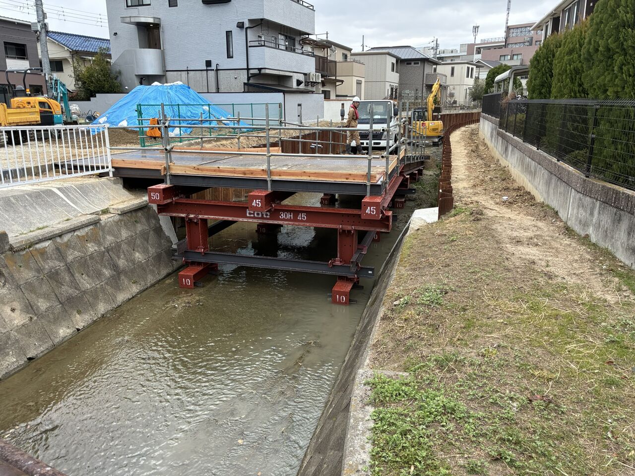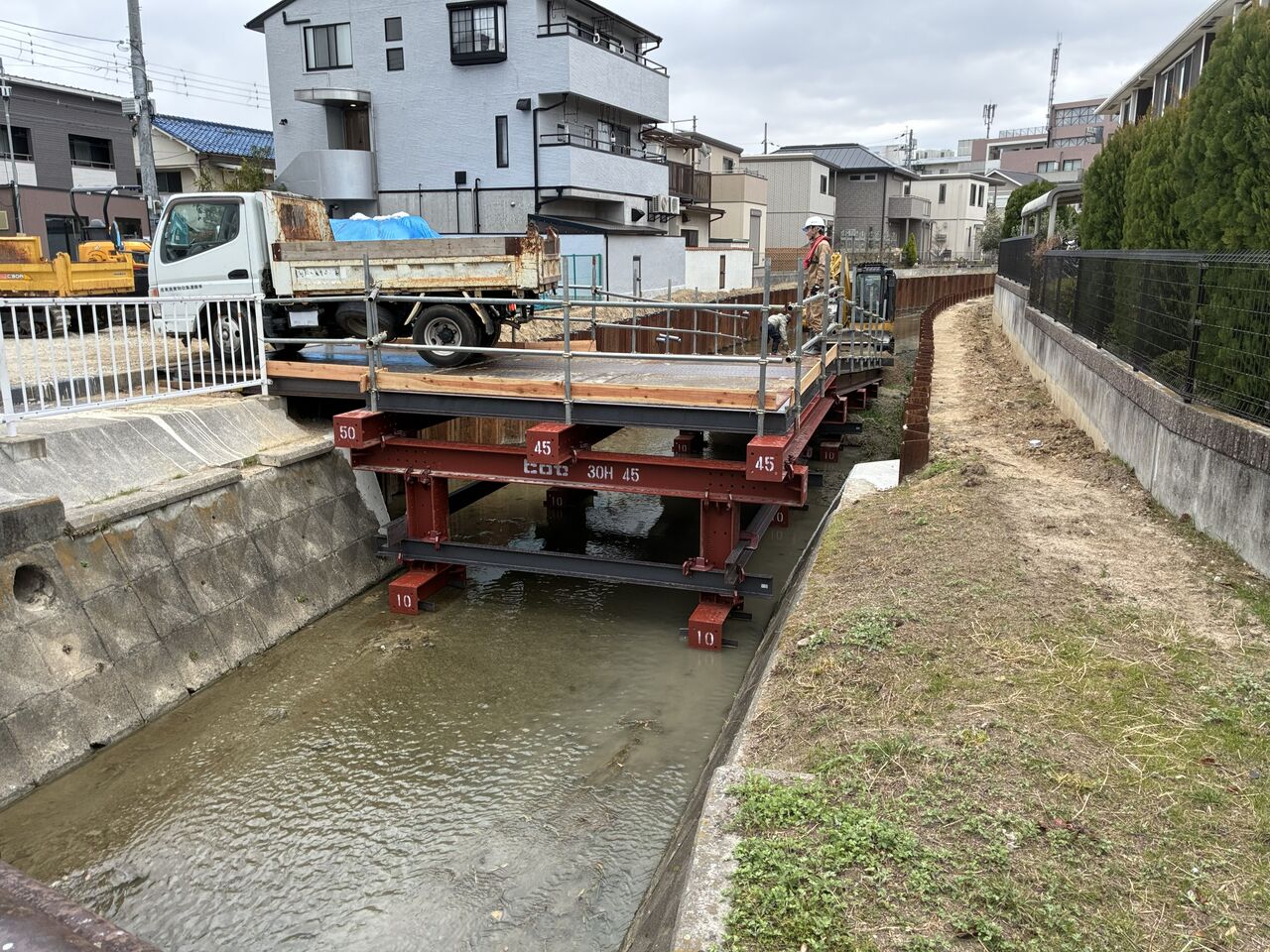 で、そこに河道いっぱいに鋼製坂路が仮設されている。