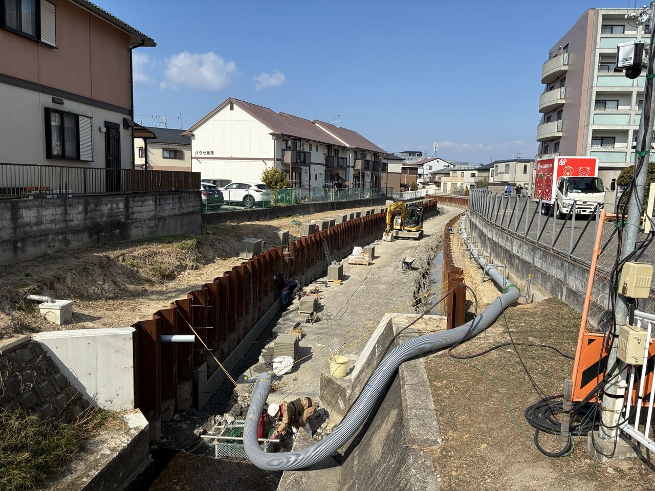 両岸の矢板にパネルを設置しているところでした。