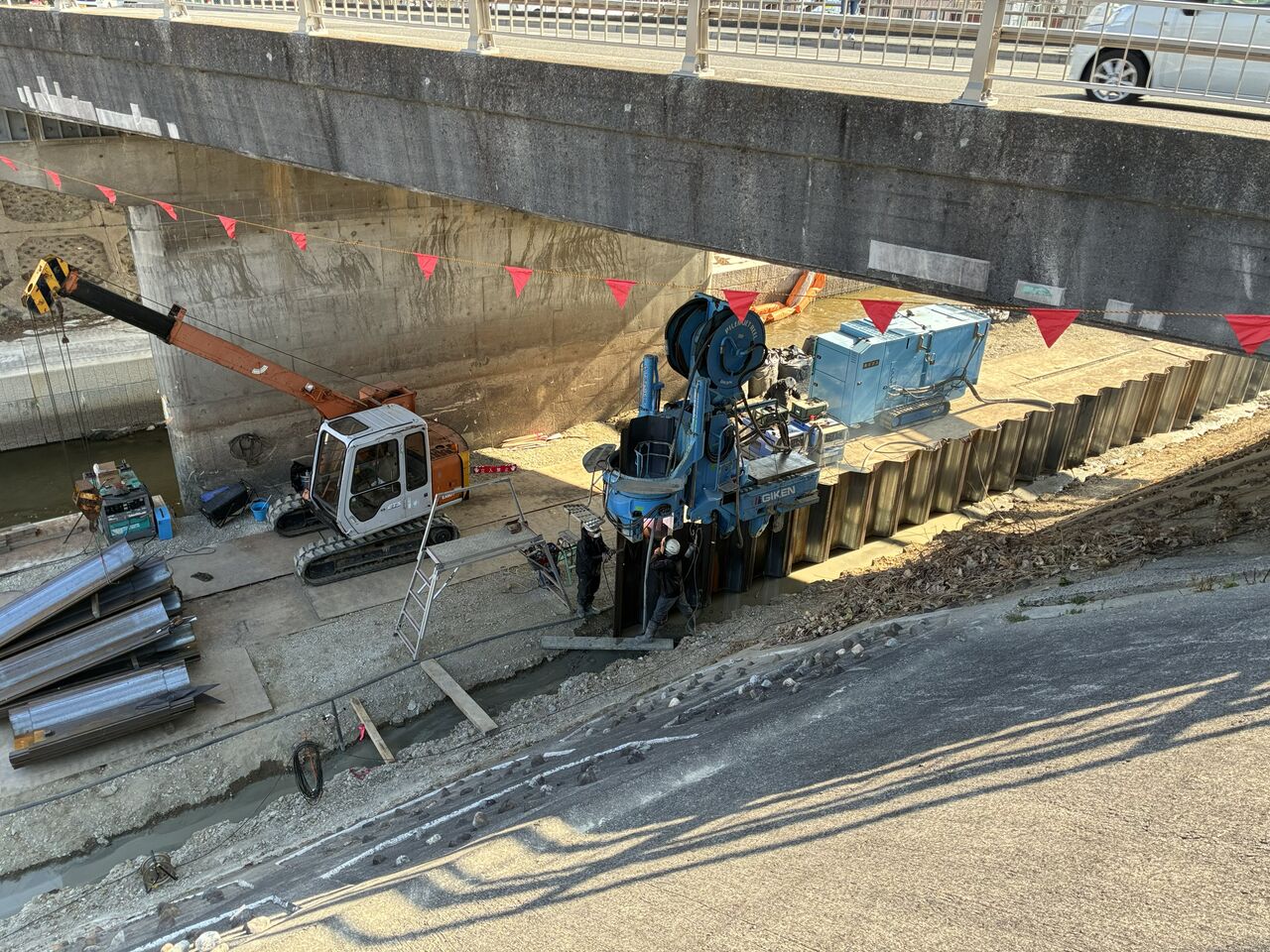 その上流では、矢板護岸の前面にパネル貼り施工を追っかけるように施工していました。