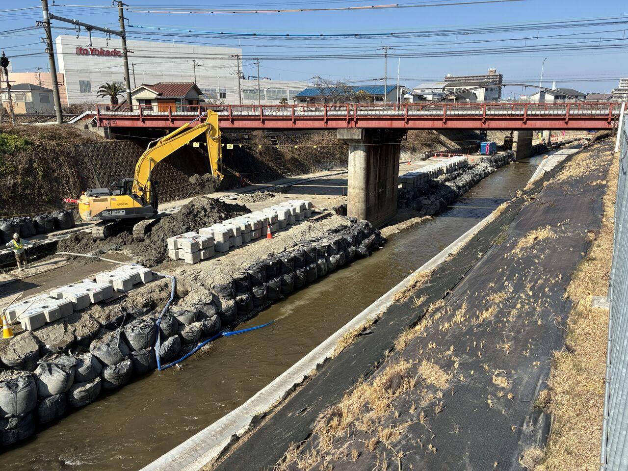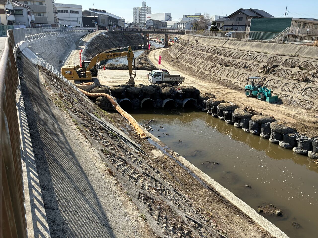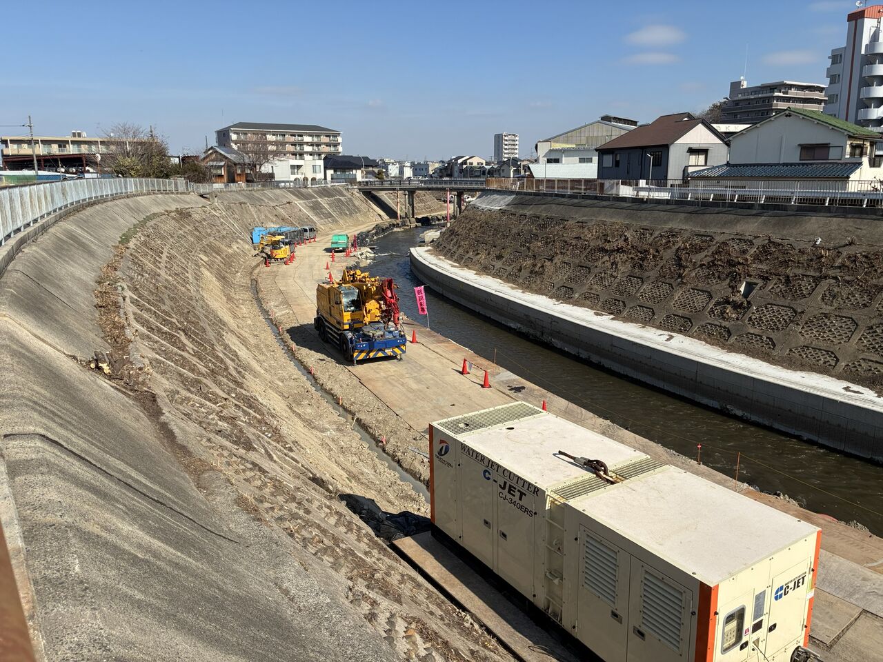 >>石津川でみつけた半川締切り工事用道路と渡河道路(教科書的な護岸工事)矢板護岸の更新工事
