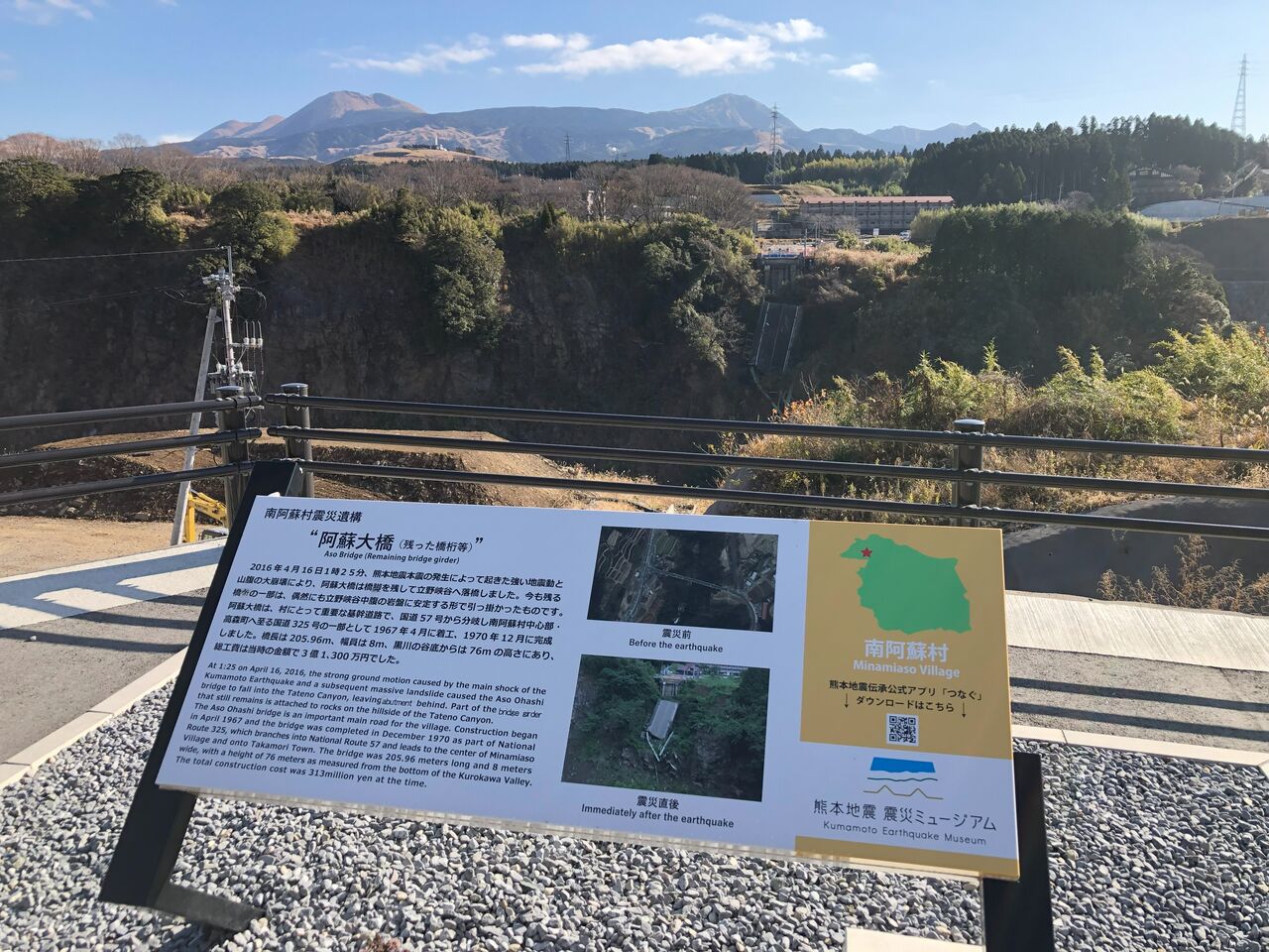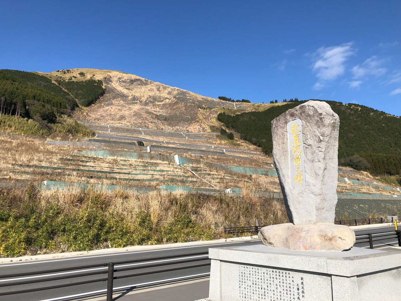 写真は、仕事で熊本へ行った際に立ち寄った「南阿蘇村震災遺構」の「阿蘇大橋(残った橋桁等)」と、その対面斜面の大規模崩壊対策地(切土法面として復旧)です。数鹿流崩之碑が建っています。
