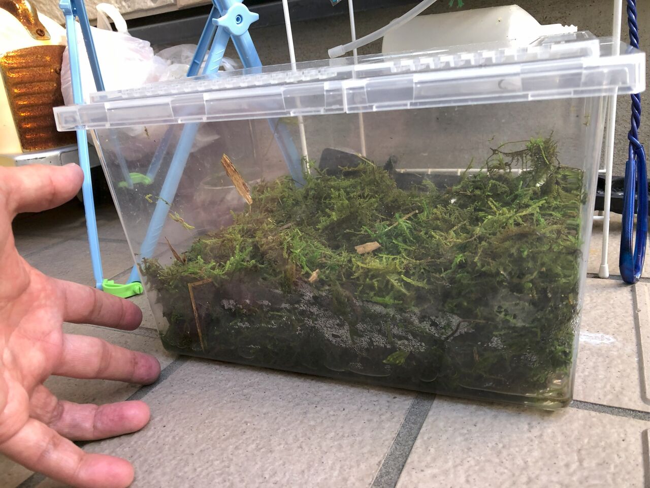 プラ水槽に、ミズゴケを5~10cmで敷き詰め、その中に3匹のヌマガエルが潜んでいます。
