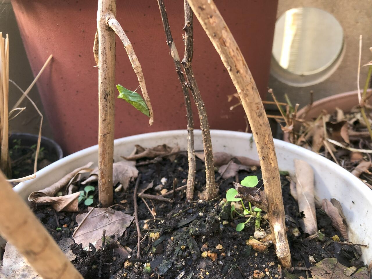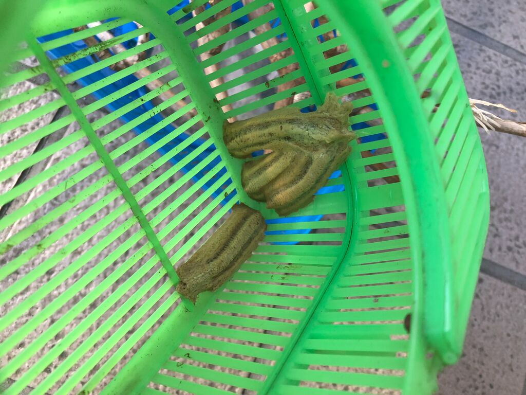 蛹になる前に、逃げないように(蛹になるのに場所を移動する習性がある)、ビニール袋を被せて、ここで蛹になってもらうよう強制しました。