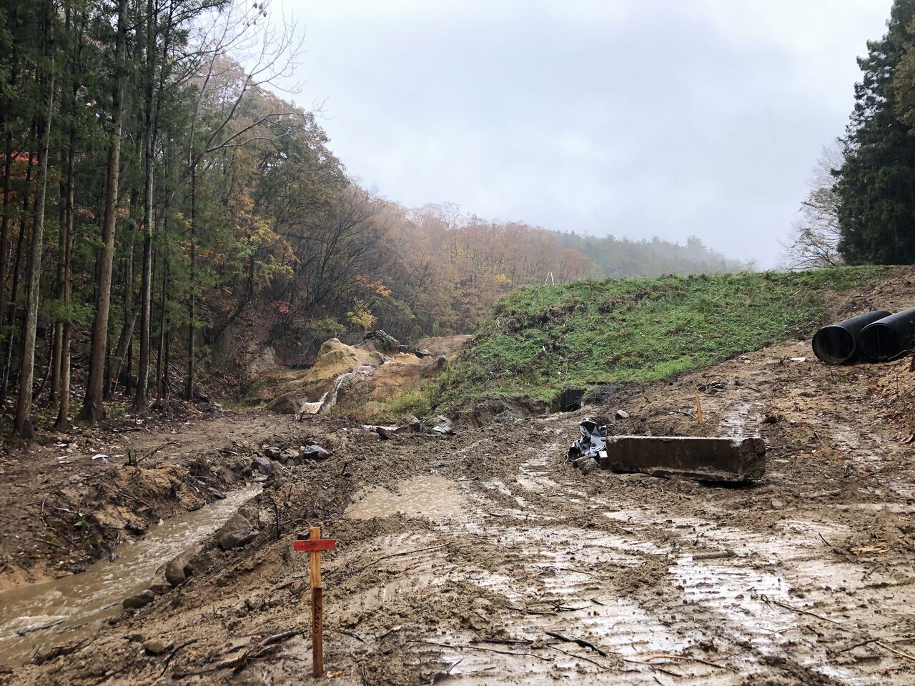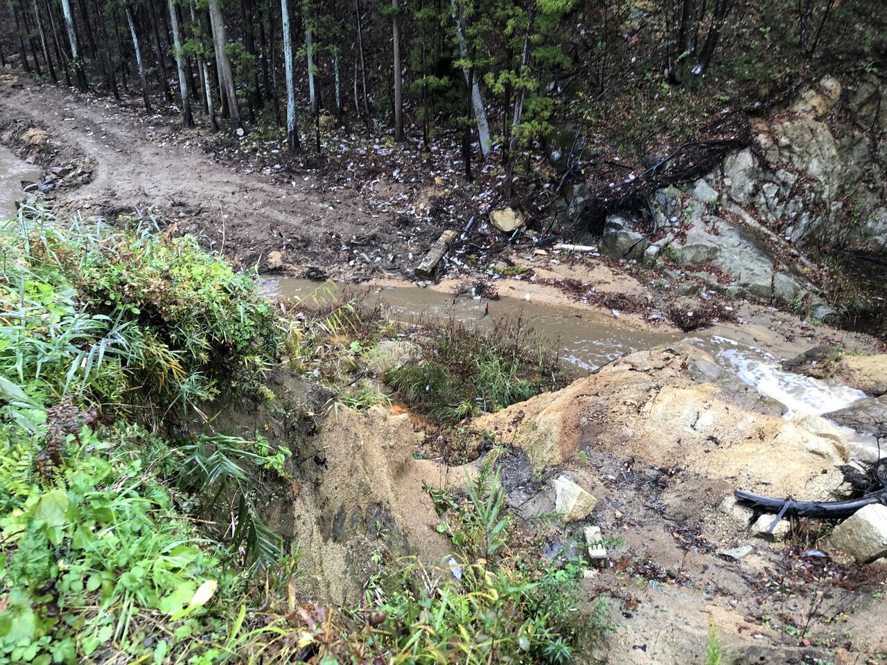 ↑これは、堤体崩壊・流出部の近景です。岩盤の上に堤体盛土が載っていたのでしょうか?すべり易い条件にあったのかも知れません。あくまでも推測です。