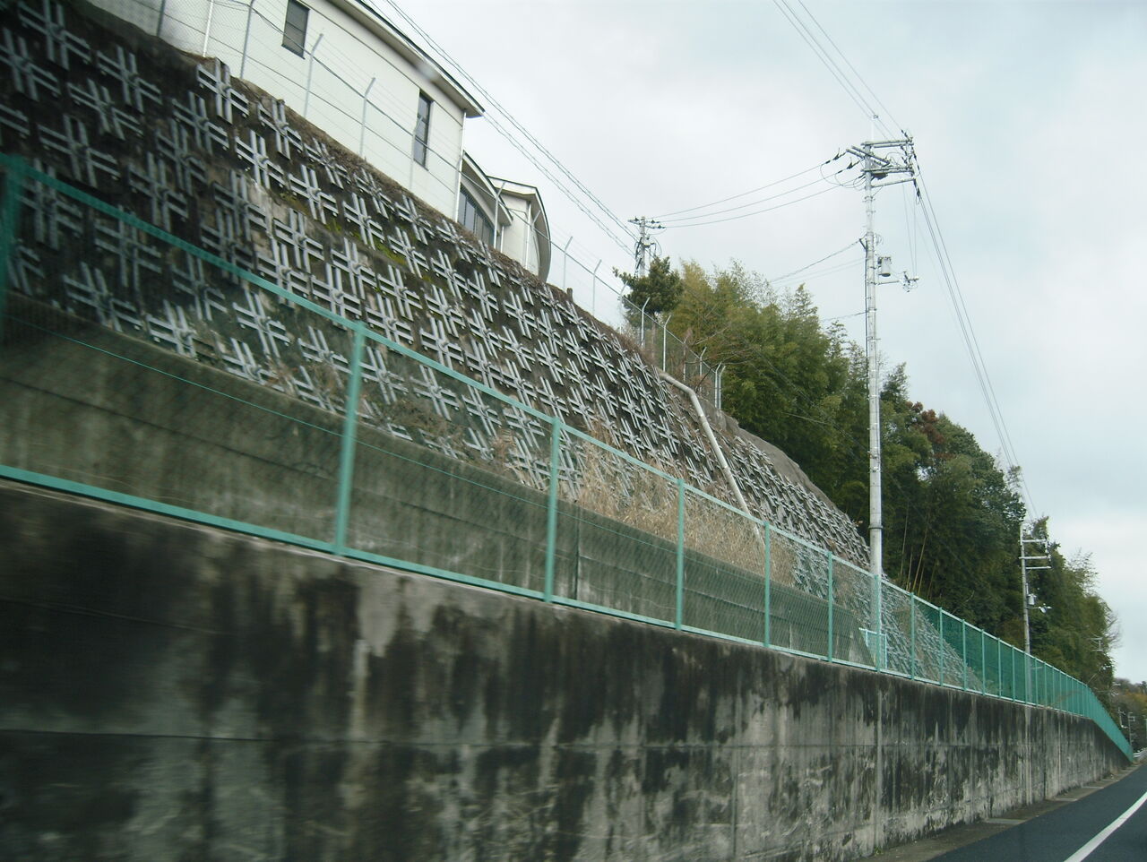 下の写真は、ついでですが、奈良県内の道路を走ってて見えたモルタル吹付へKITフレームを受圧板にした法面です。KITフレームも緑化性能を有する製品ですが、別に緑化が必須ではありません。