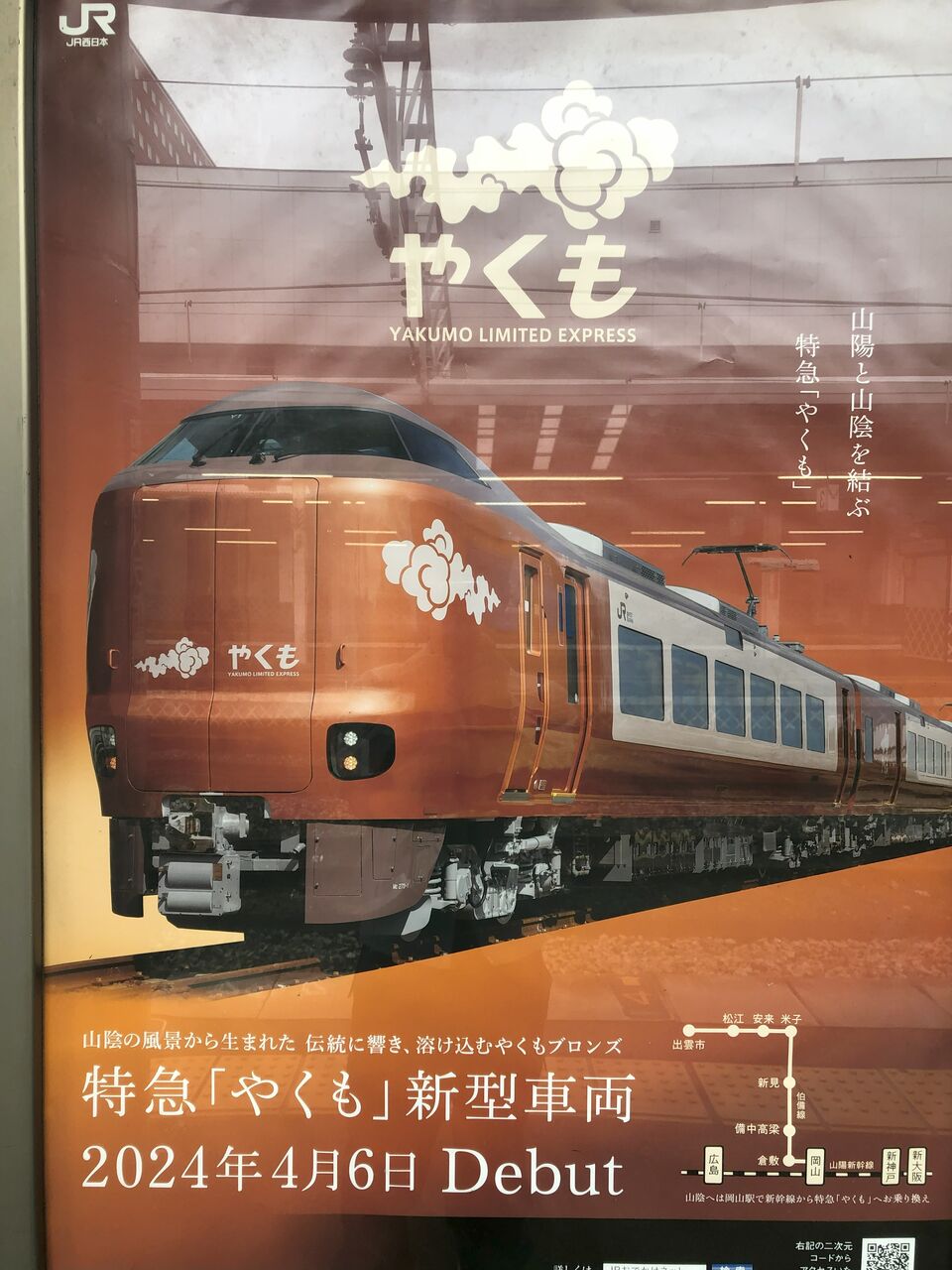 新型やくもデビュー2024.4(さよなら旧型ありがとう) 2024年12月17日 12:45 今年(令和6年)の4月、特急やくもが新型に代わりました。 残念ながら新型にはまだ乗ってないです。 ちょうど新型デビューの直前に、岡山駅に居た時に新型デビュー案内ポスターと、去り行く旧型車両を写真に収めていたので紹介します。 もう、走ってないんですね旧型車両。 ポスターです。 旧型車両です。 これはこれで、かっこいいです。 乗客の安全を優先するので、老朽化車両を替えていかないとならないのは仕方の無いことですが、なんか寂しいですよね。 旧型雷鳥が、全部サンダーバードに代わった時も、寂しかったのを思い出しました。 ノーズの出た雷鳥がなんか好きでした。 「鉄道など」カテゴリの最新記事 タグ :#岡山 < 前の記事次の記事 > コメント コメントフォーム 名前 コメント 記事の評価 リセット リセット 顔 星 情報を記憶 コメントを投稿する