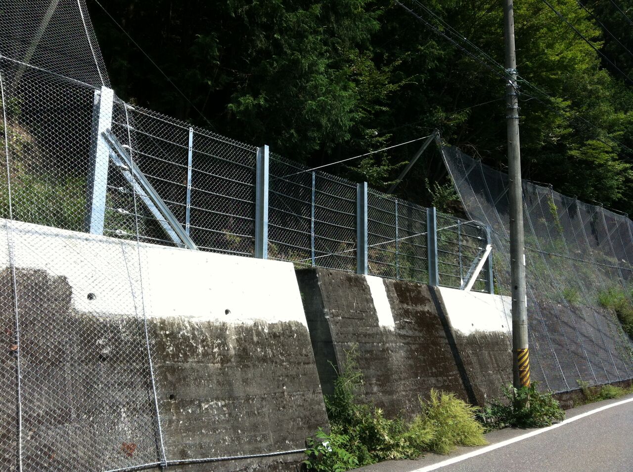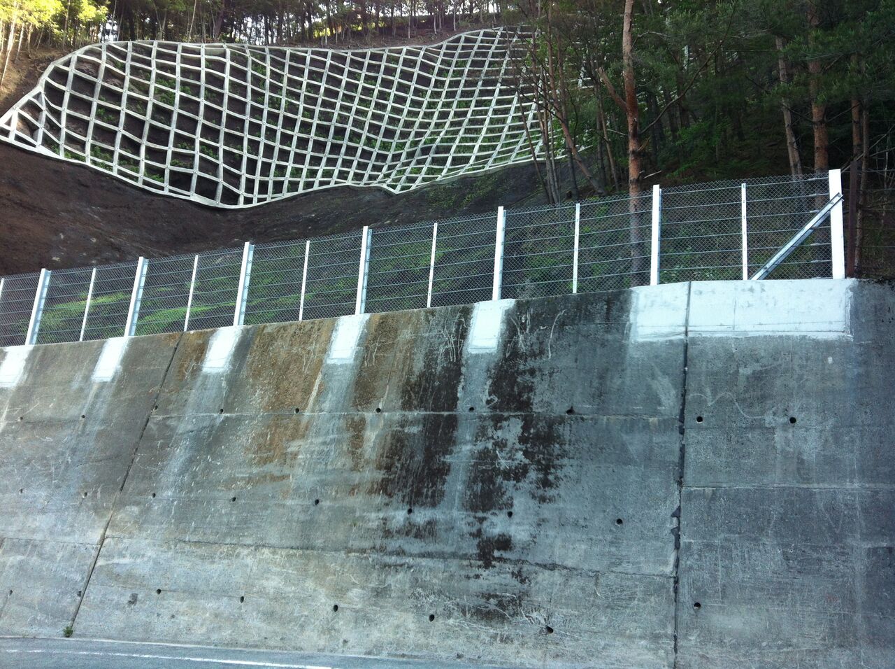 既設の擁壁の上にあった落石防護柵を更新したもの。