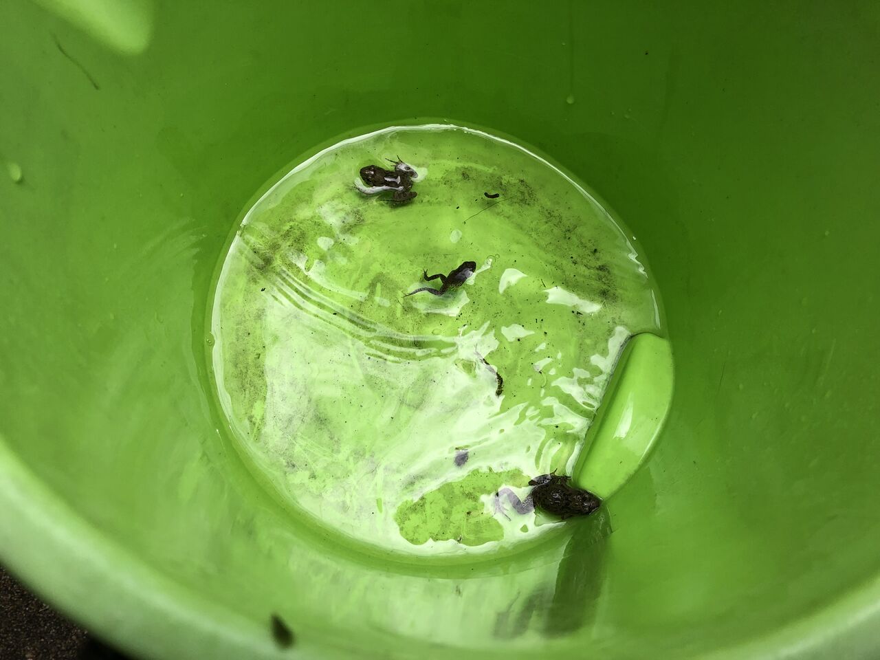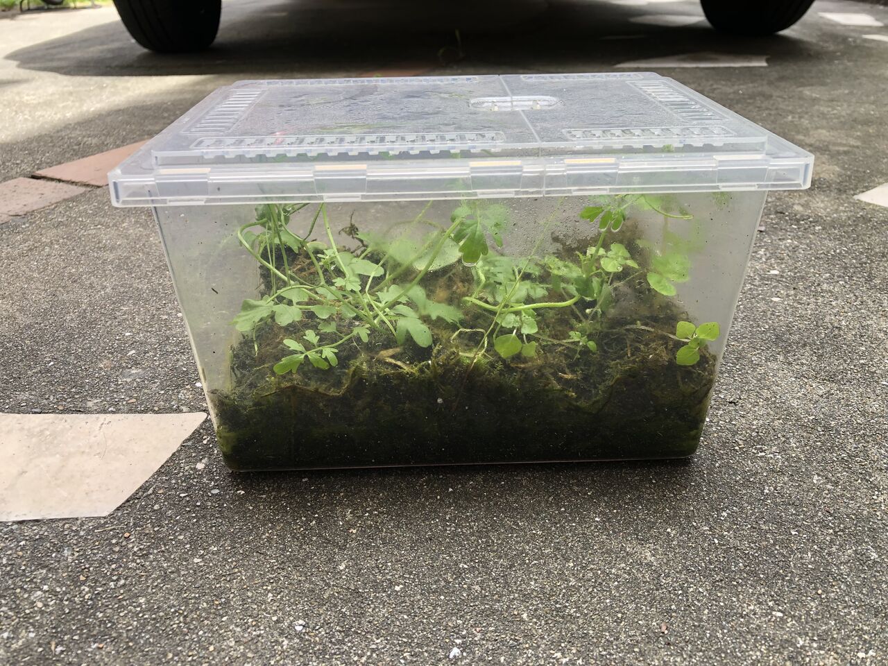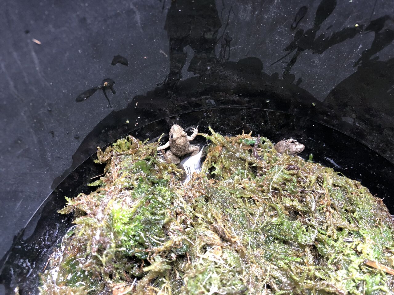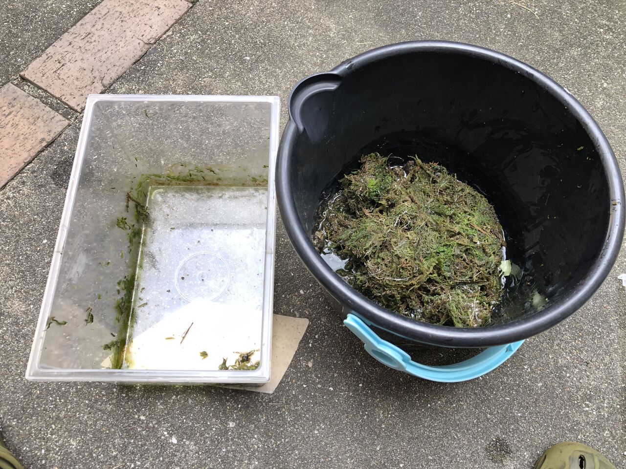 水、足場の土ゾーン。メダカバケツから藻を少し拝借。