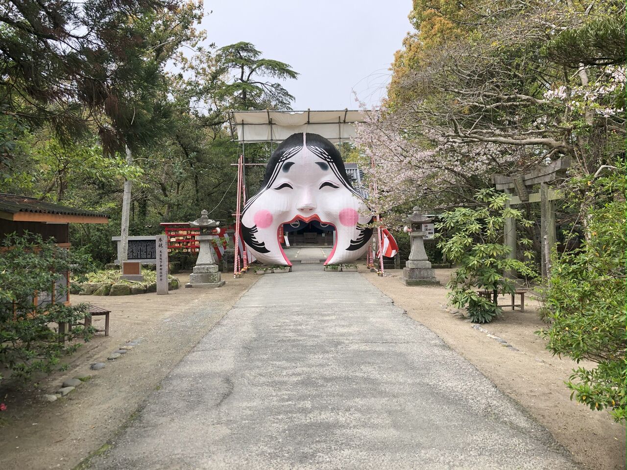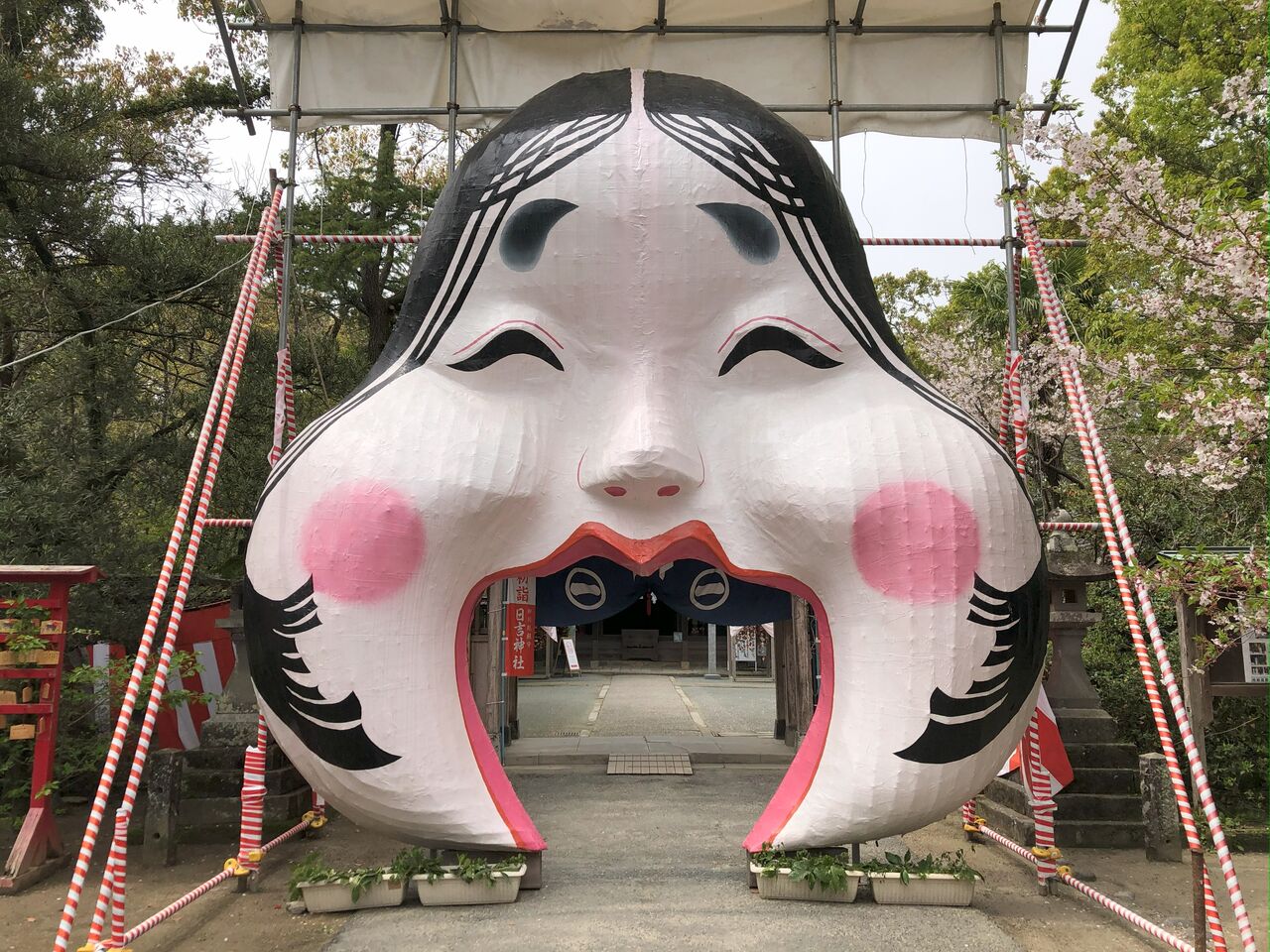 毎年12月下旬から「柳川雛祭りさげもん巡り」の最終日である4月上旬までお多福の巨大なお面がくぐり門として飾られているそうで、私が行った3月下旬はギリギリセーフで見れました。
