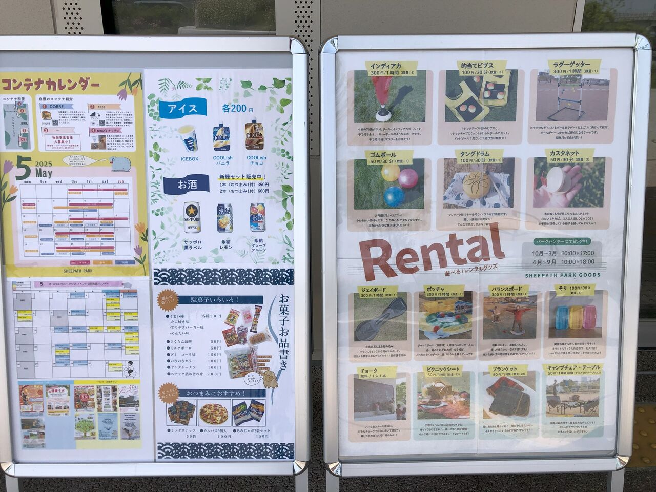 管理事務所にはイベント情報のほか、レンタル案内もあります。