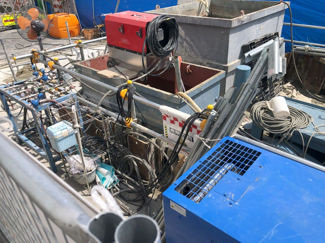 グラウト注入するための機器が所狭しと並んでいます。