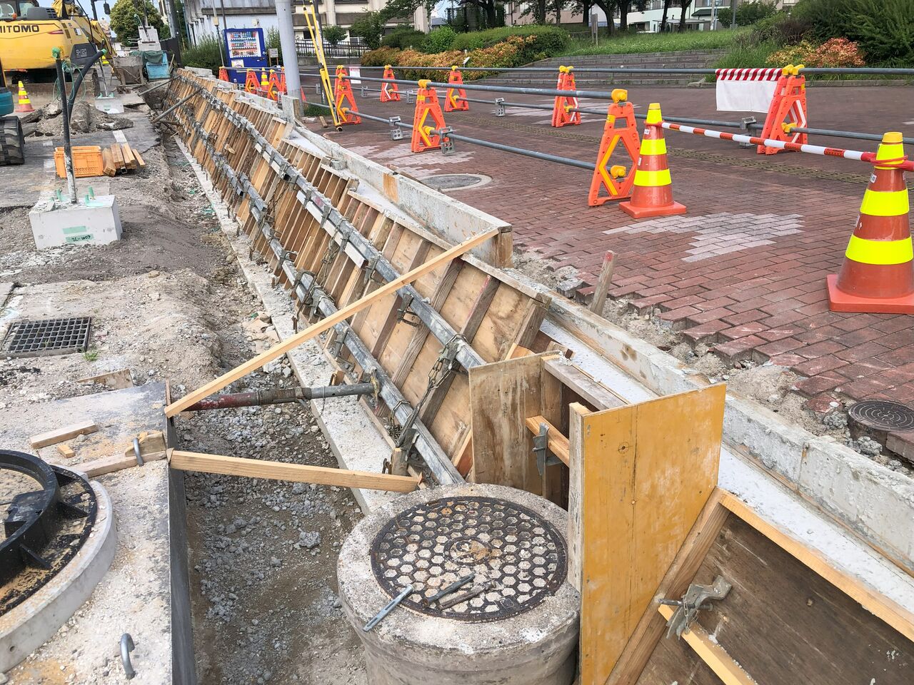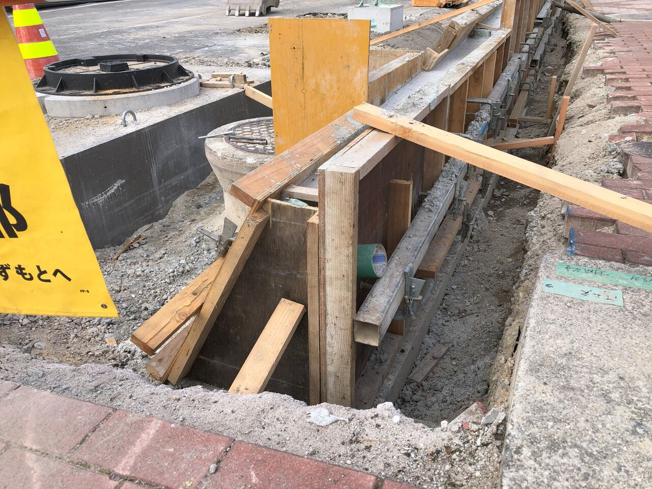 人孔(マンホール)のところを上手く交わして型枠を組んでいる。