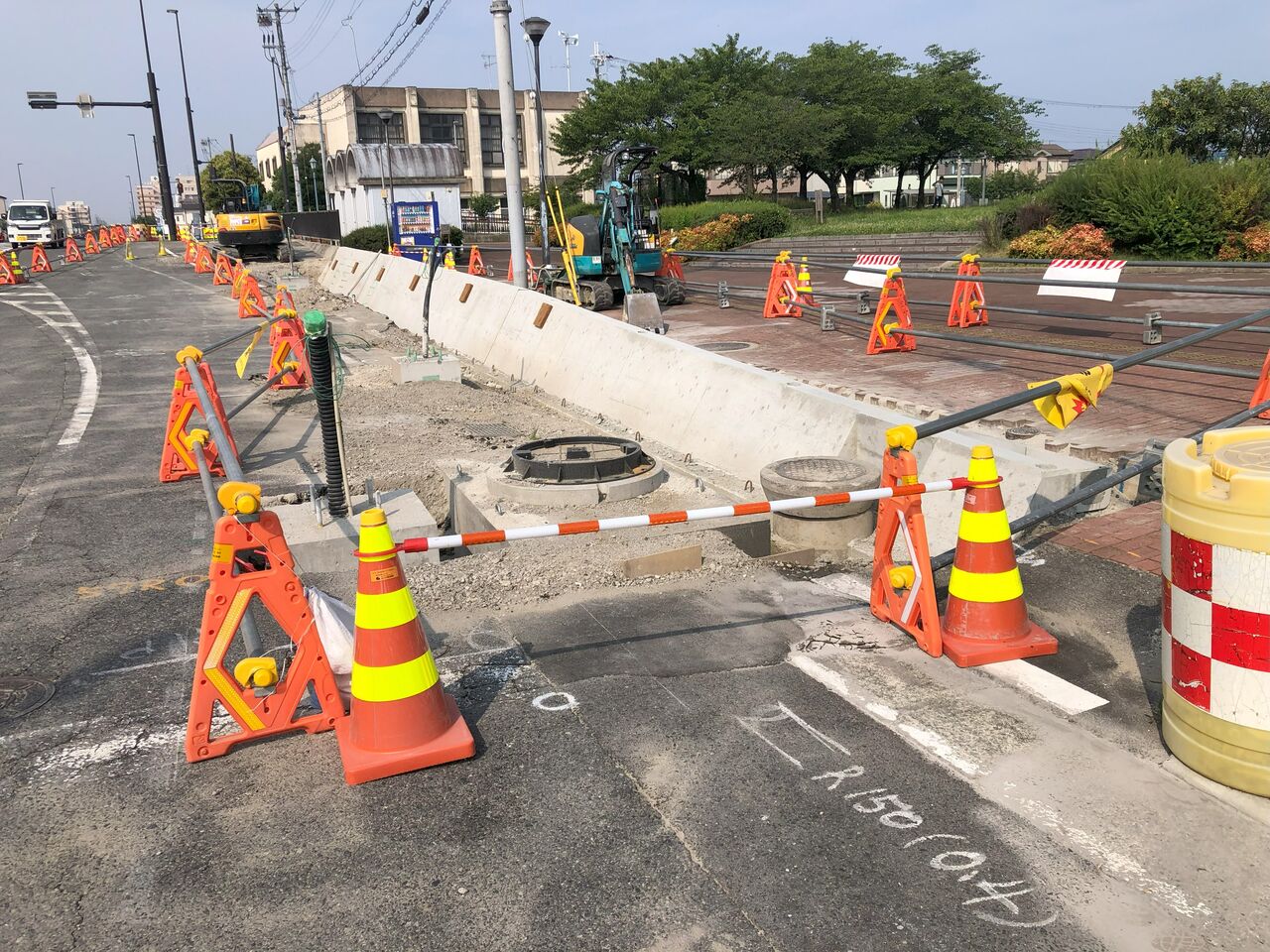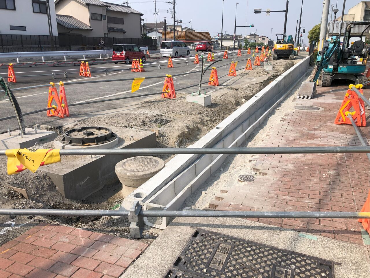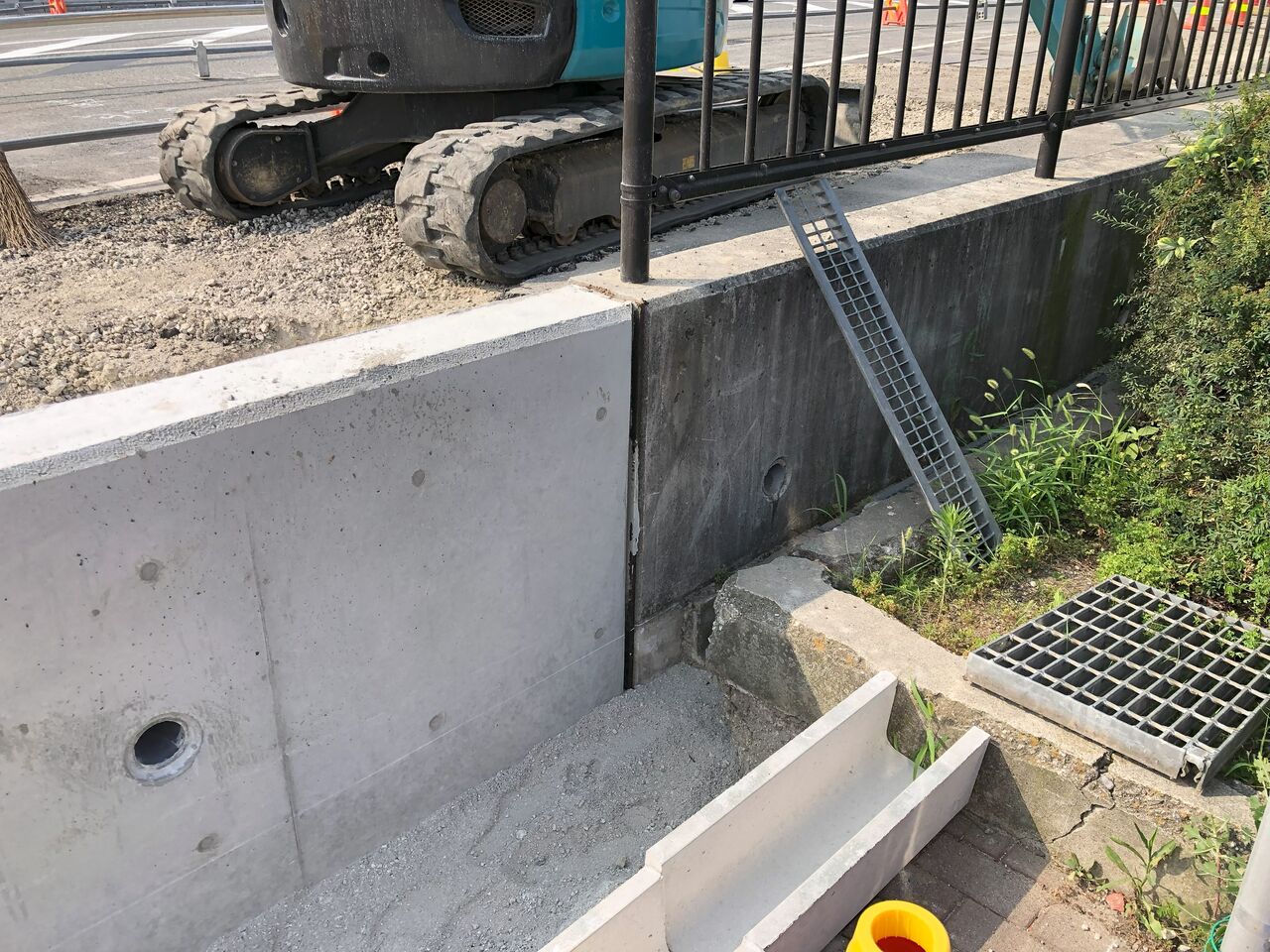 道路の外側はプレキャスト側溝を設置している最中のようです。