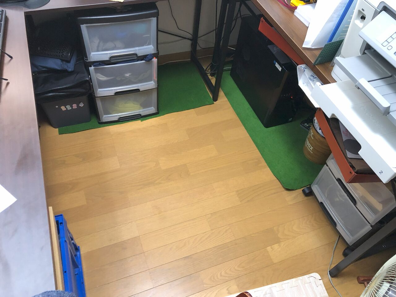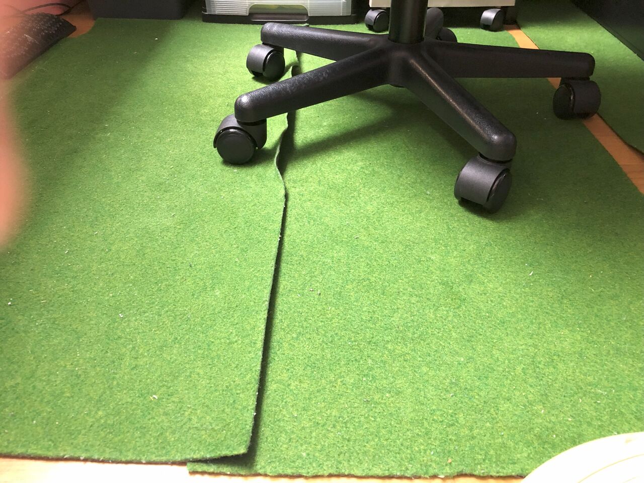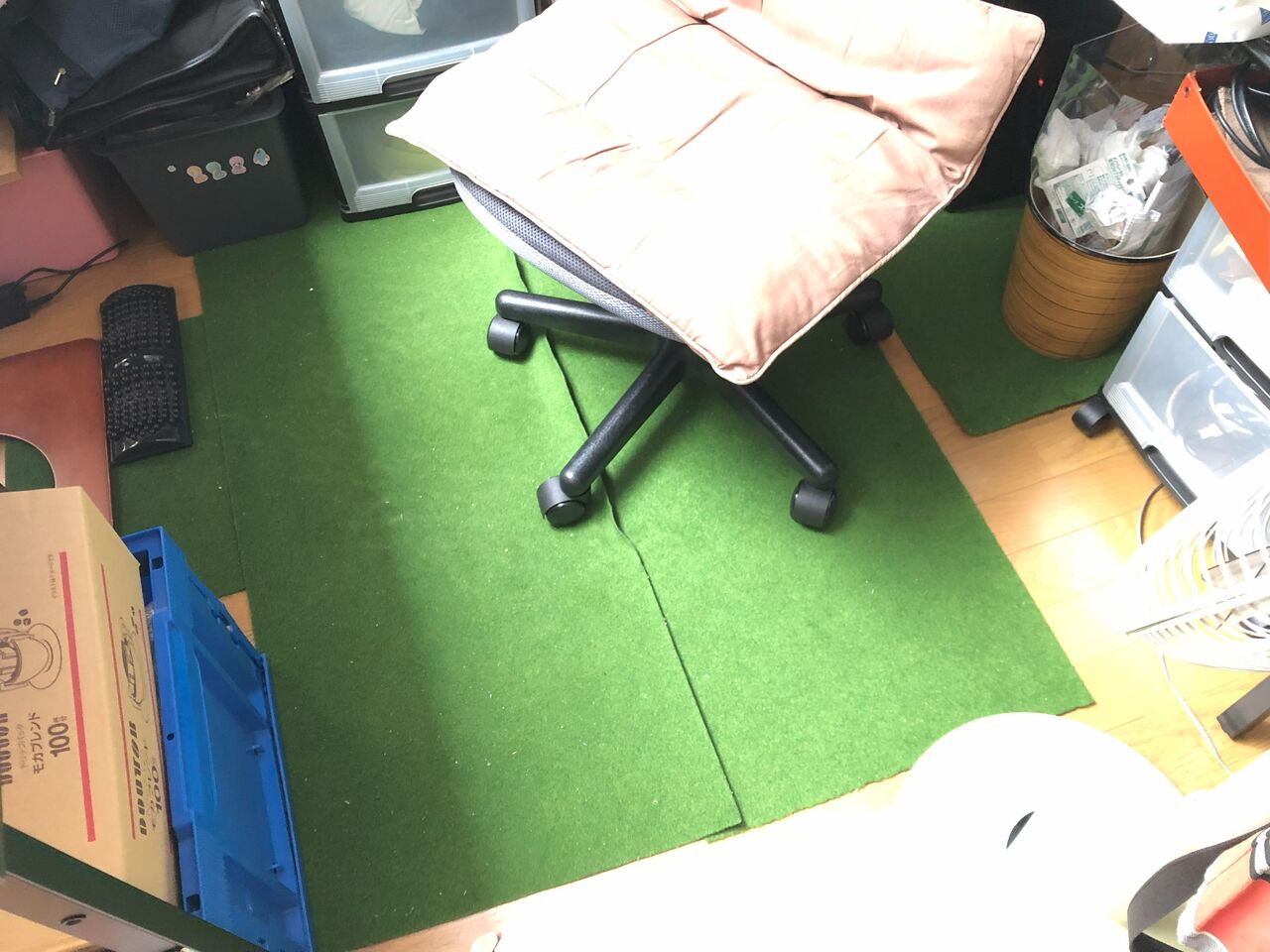 椅子のタイヤでフローリングがへこむのが嫌で、ゴルフのパター練習用のマットを切って並べて対応していました。