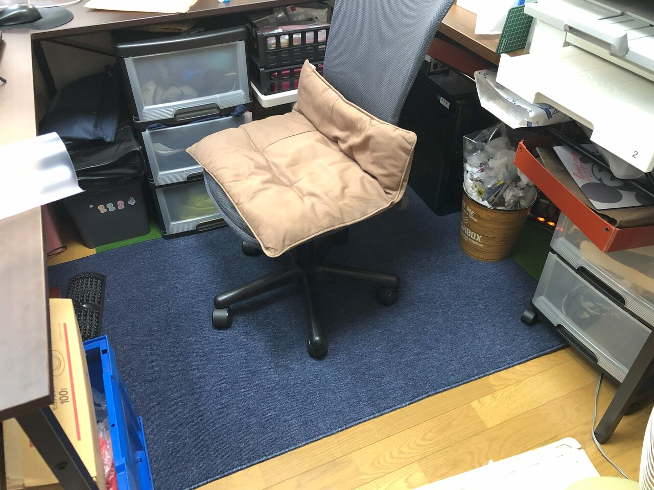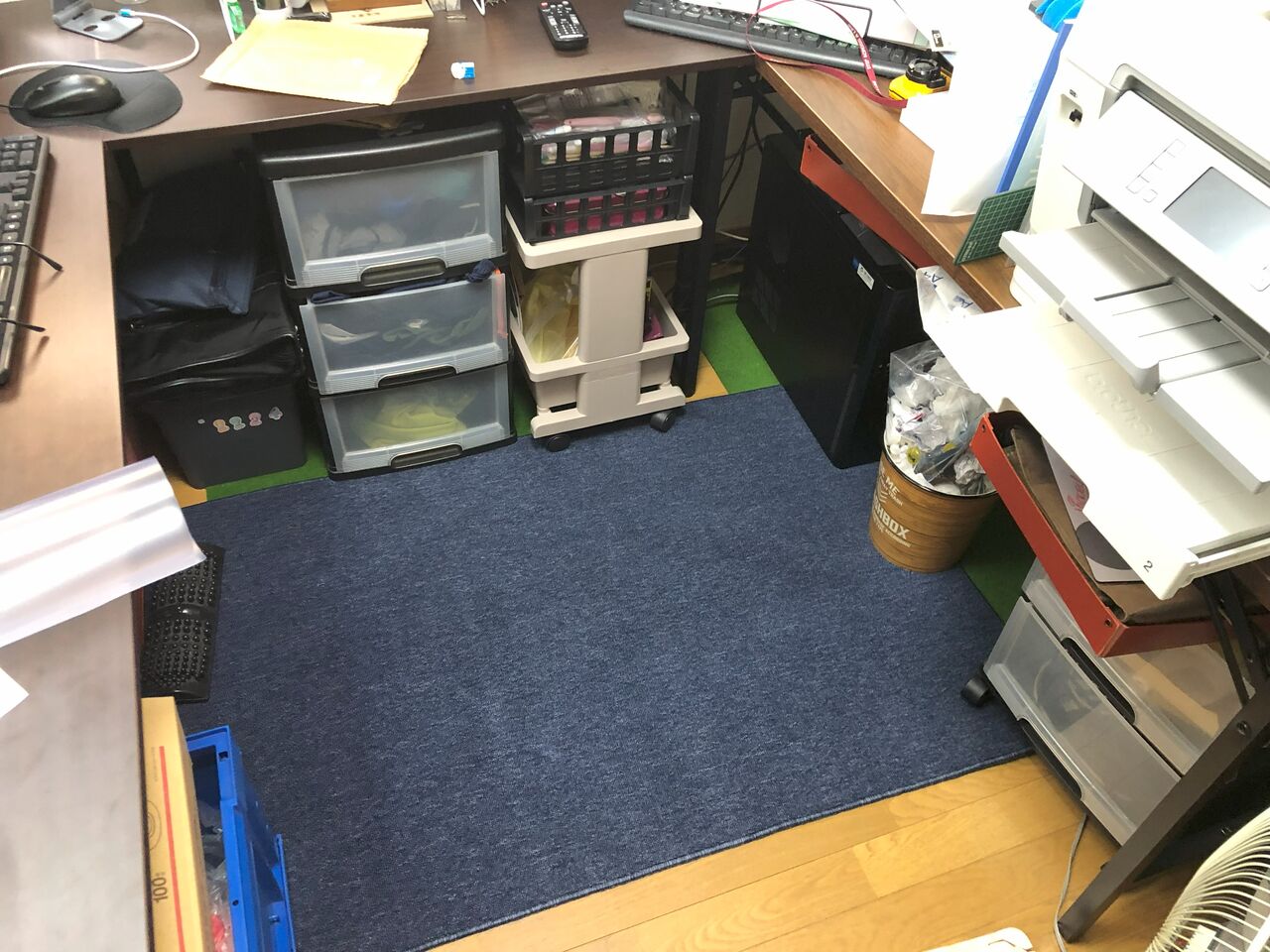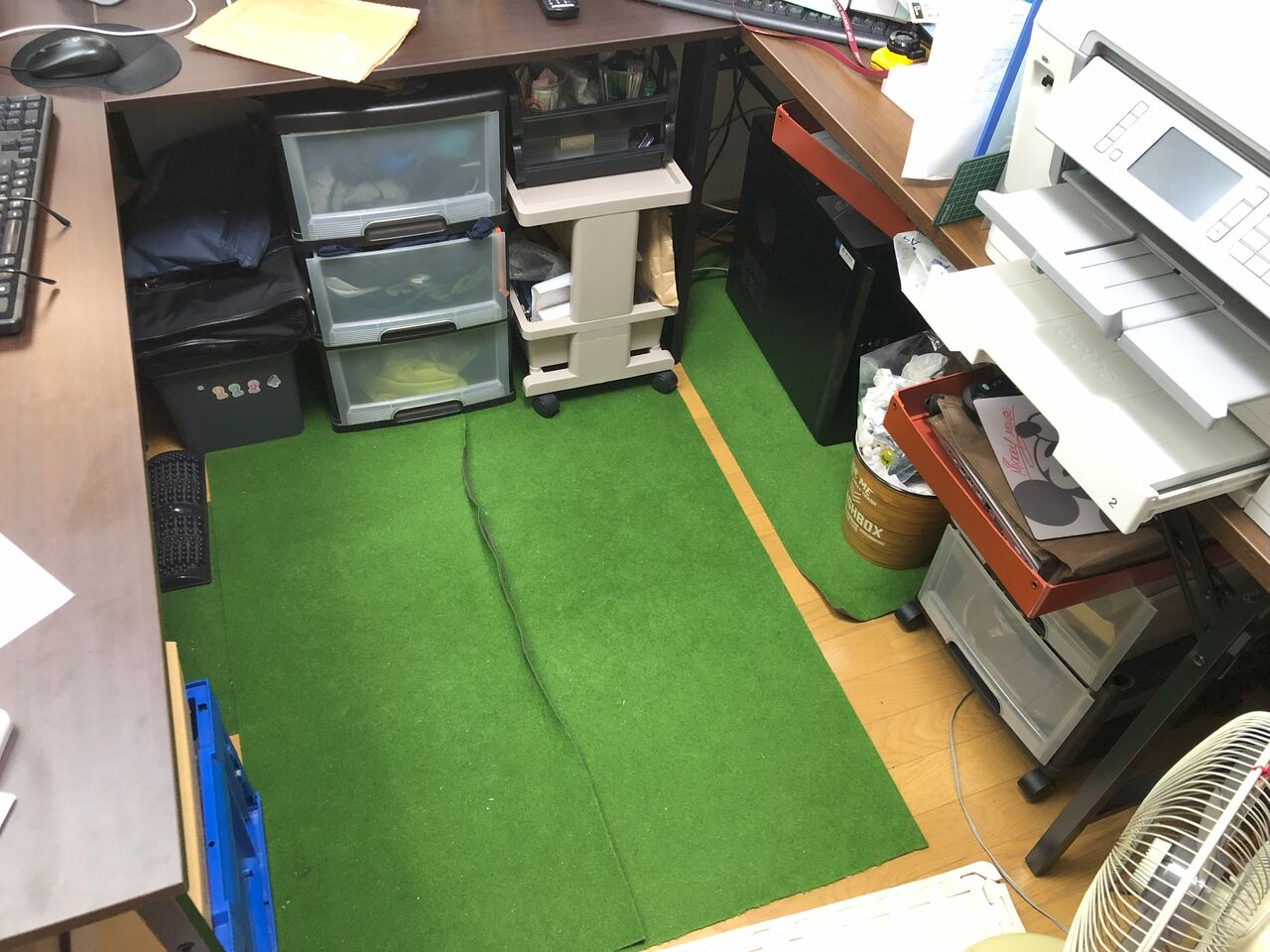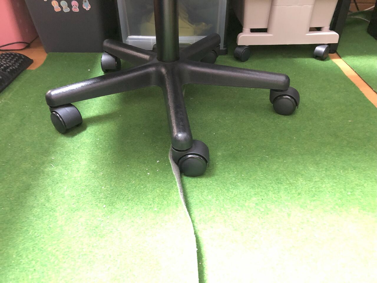 椅子のタイヤでフローリングがへこむのが嫌で、ゴルフのパター練習用のマットを切って並べて対応していました。